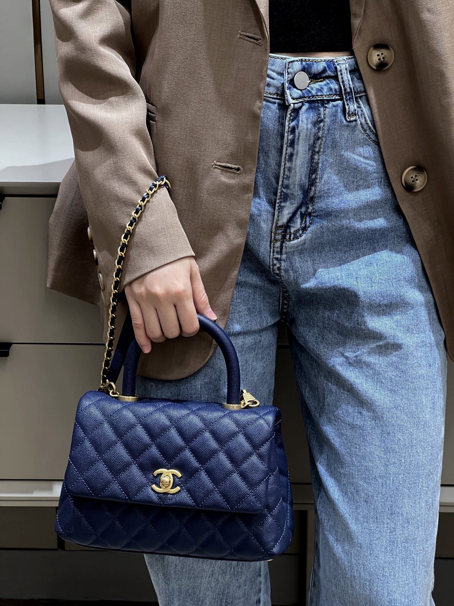 CH FLAP BAG WITH TOP HANDLE 24 Small Grained Calfskin Navy Blue